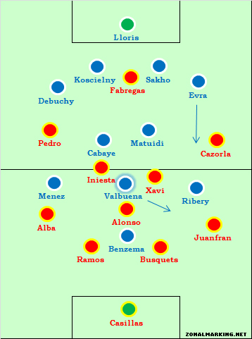 Valbuena: Il suo ingresso in campo porta una ventata d’aria fresca. Deschamps lo colloca tra le linee di difesa e centrocampo spagnole, ed il folletto marsigliese lo ripaga con una prestazione tutta pepe. VOTO 7
