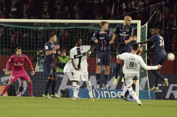 Ottenuto il pari, il Psg si butta in avanti. I primi risultati arrivano intorno alla mezz’ora, quando il portiere degli ospiti Costil stende in uscita Menez e si becca un rosso francamente ineceppibile. A quel punto tutti si aspettano l’immediato goal del raddoppio parigino, ma ci pensa Feret a sovvertire i pronostici con una splendida punizione dal limite che agira la barriera rouge et bleu e soprende un Sirigu non proprio irreprensibile.